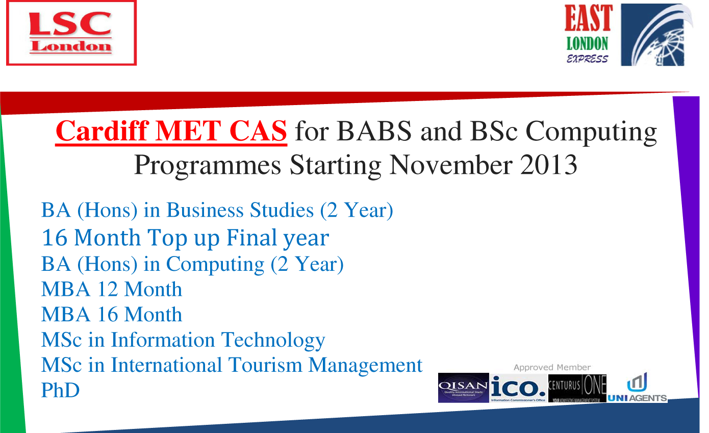 We are processing application for Cardiff Metropolitan University for their London campus. University will accept application for November intake 2013 on following subject BABS, BSc computing  MBA & PhD. Last date of overseas student application on 16th October 2013 & Local student application 20th November 2013.